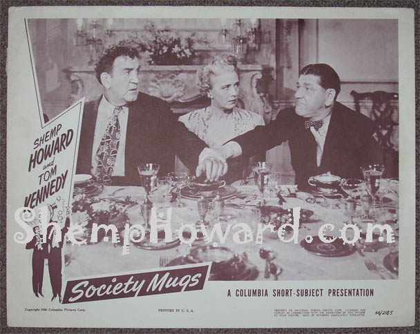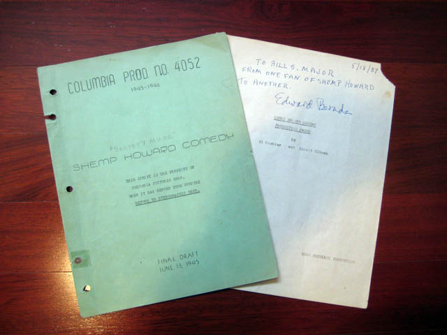 Here is an incredibly rare collectible, a "Society Mugs" script from this Shemp Short Subject. The photo below features Shemp, director Ed Bernds (holding the exact copy of the script shown under the photo), and co-star Tom Kennedy.